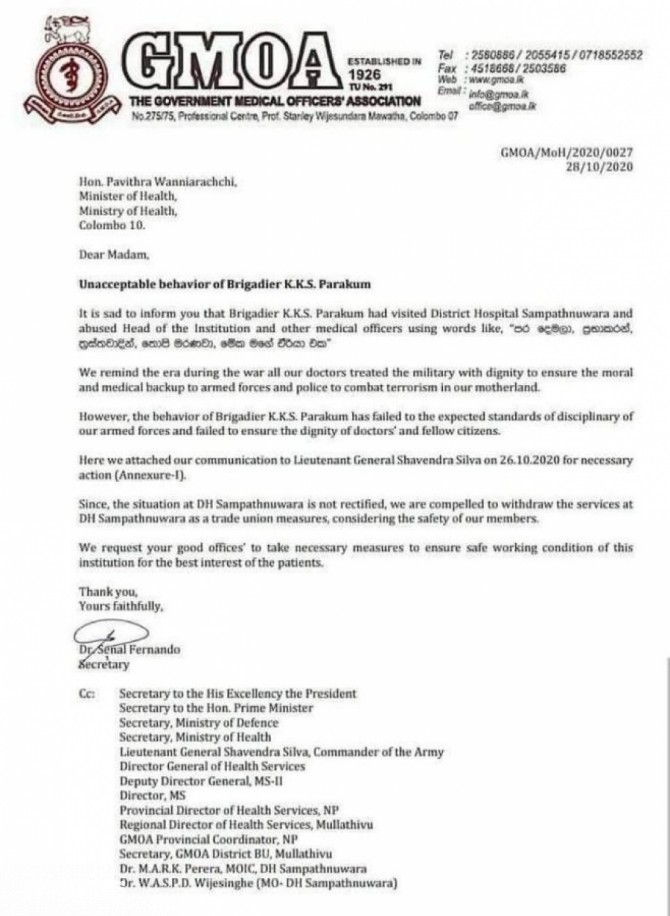 பிரிகேடியர் கே.கே.எஸ்.பரகும் குறித்த வைத்தியசாலையின் வைத்தியரை மிரட்டியதன் விளைவாகவே தாம் இந்த முடிவை எடுத்ததாக சுகாதார அமைச்சர் பவித்ரா வன்னியராச்சிக்கு அவர்கள் எழுதிய கடிதத்தில் குறிப்பிட்டுள்ளனர்.