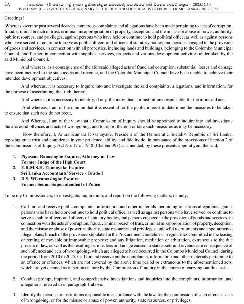 The government has appointed a Presidential Commission to investigate alleged corruption and irregularities at the Colombo Municipal Council (CMC), signaling a strong move to enhance accountability in local governance.