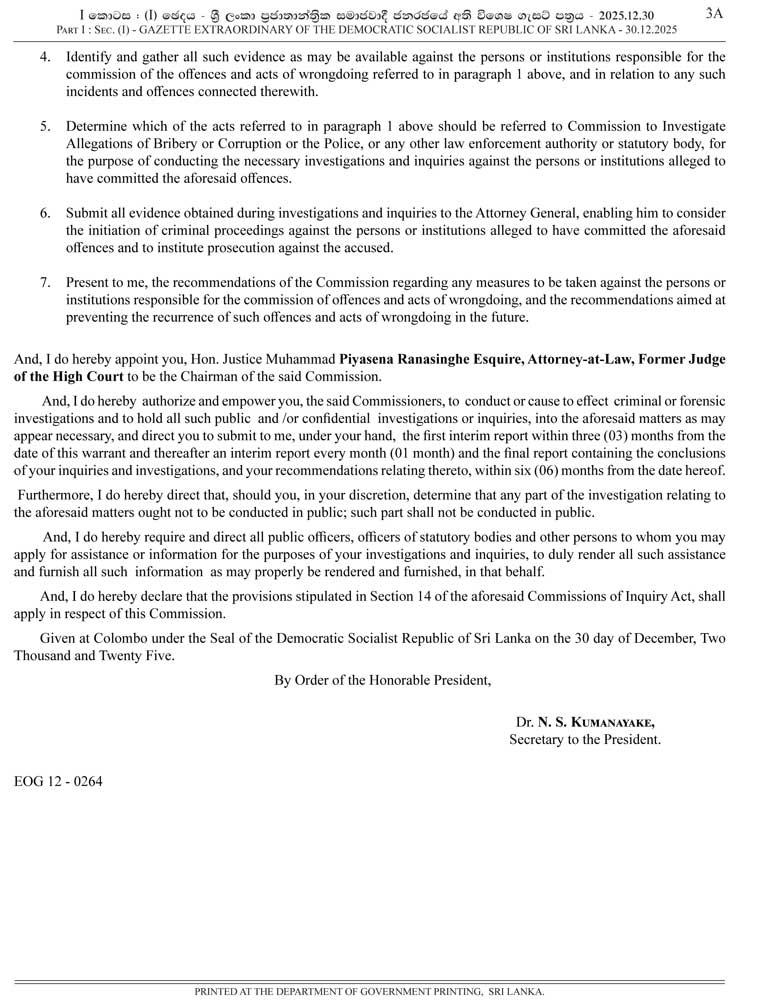 The appointment was officially announced through a gazette notification signed by the Secretary to the President. Authorities say the Commission is expected to conduct a thorough investigation and submit a detailed report on its findings.