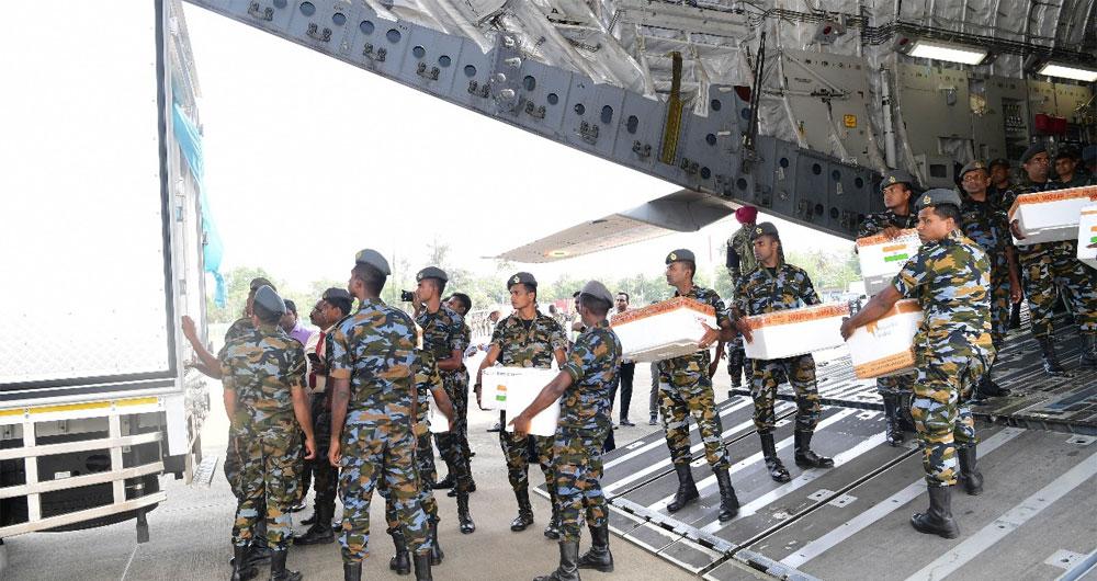 The consignment of 17 essential drugs and more than 14,200 kgs of dry food was handed over to Health Minister Nalinda Jayatissa by Indian Deputy High Commissioner Dr. Satyanjal Pandey at the Bandaranaike International Airport (BIA).